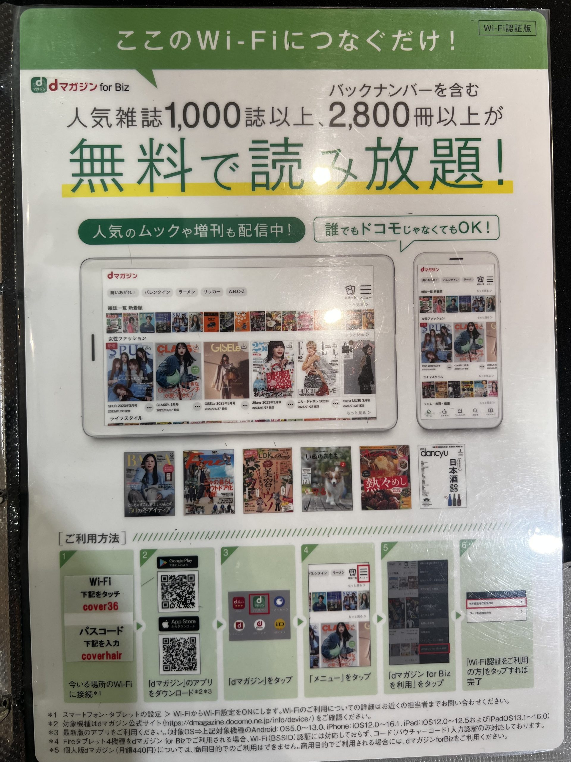 当店のWi-Fiに接続していただいてdマガジンのアプリを入れていただくと、