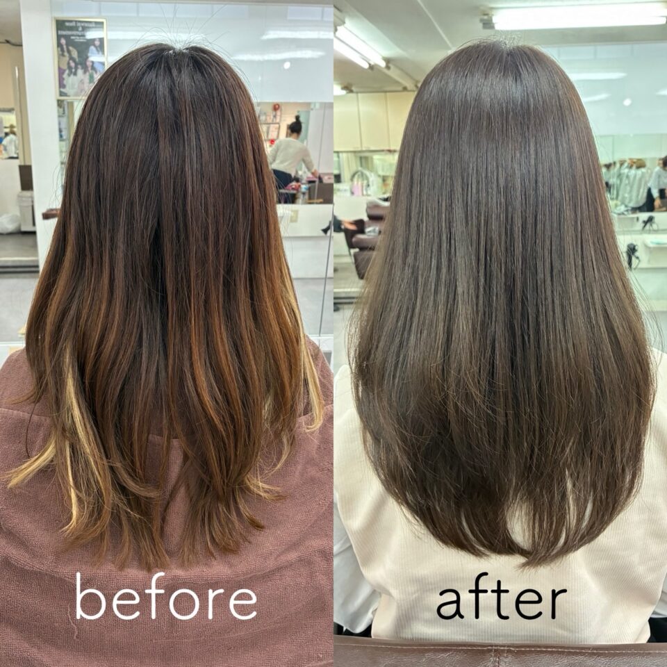毛髪内部を補修しながらカラーを入れるため、ダメージ部分だけが硬くならず、