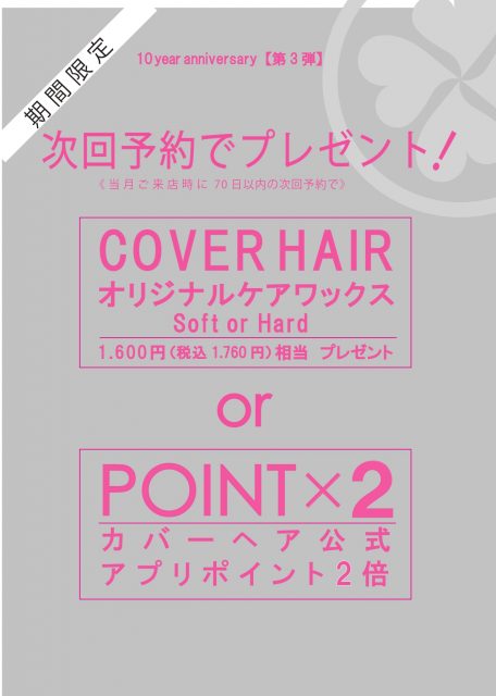 今月は次回予約をおとり頂くと、Coverhairのアプリポイント2倍又はオリジナルのケアWAXのプレゼントをさせて頂いております!