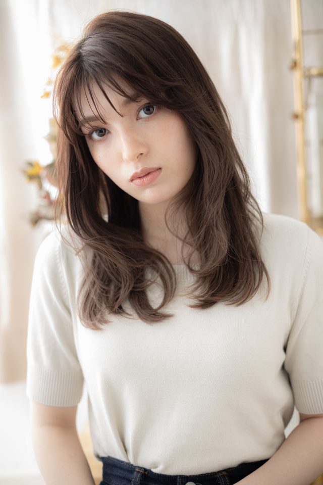 シースルーバングやかきあげ前髪、斜めバングや厚めバングで小顔にヘアアレンジ。くせ毛風ゆるふわミディや耳かけ、前下がりウルフも大人かわいい。フェミニンボブ大人ボブ、ナチュラルボブマッシュボブも人気。(メイク担当:北浦和店成田)