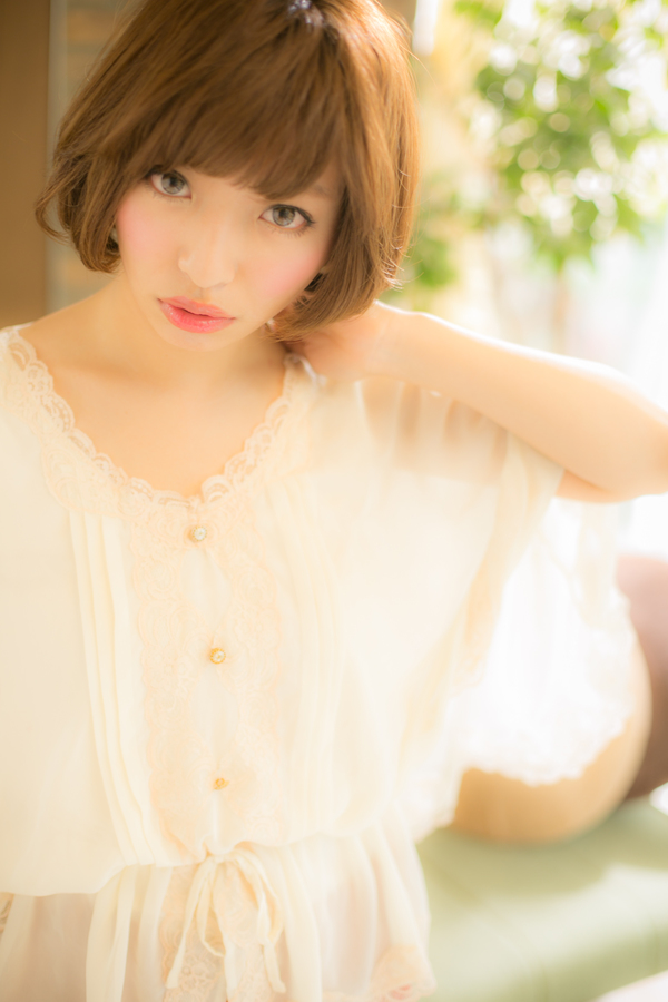 明るいカラーで柔らかく,まとまりのあるボブスタイル。自然に内側に丸みが出るくらいのパーマをかけているので,ナチュラルなふんわり感がポイント。眉ラインでそろえたバングで甘さもだし,大人っぽすぎない女子力UPの魅惑なボブ。