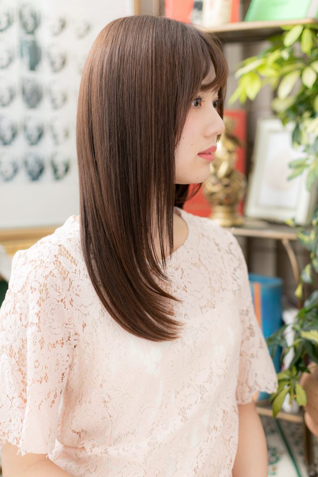 好感度大のワンカールストレートは外国人風ツヤカラーで透明感を演出してモテヘアスタイルに。斜めバングや厚めバングで目力強調したり、耳かけも大人女子のコーデを完成。髪の色はグラデーションやベージュもおすすめ!(メイク担当:北浦和店棟方)