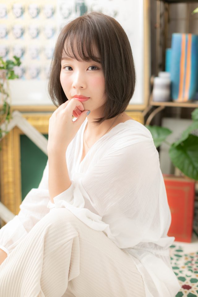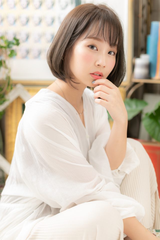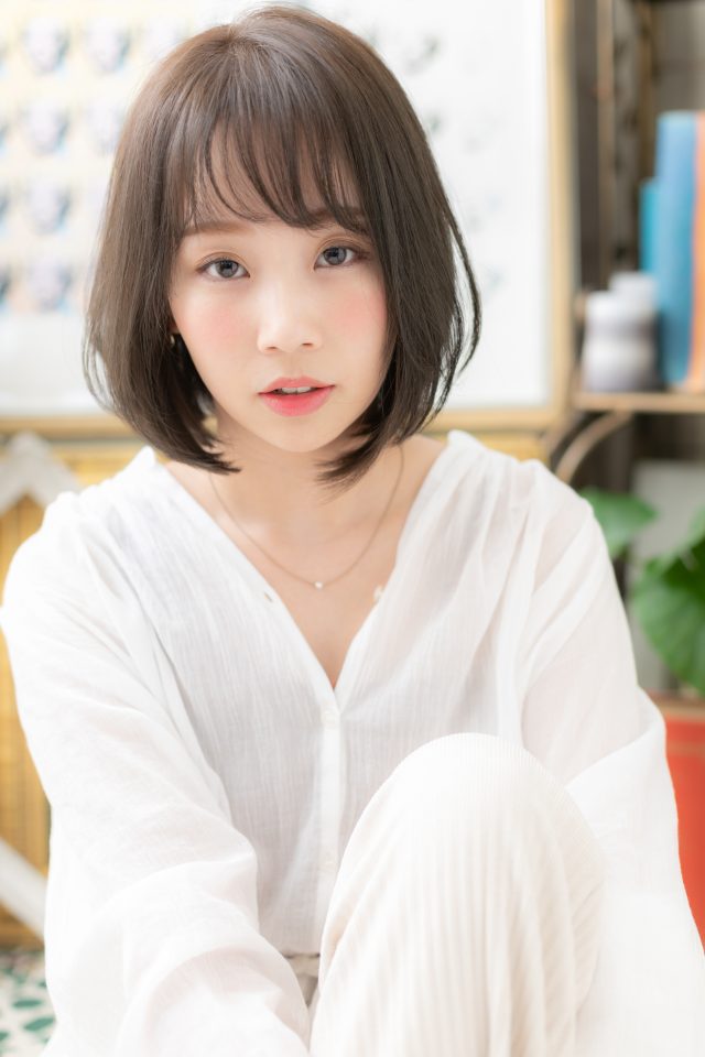 シンプルな黒髪ナチュラルボブは、シースルーバングとレイヤーカットで軽さとニュアンス感ある動きを演出し、大人女子のコーデを完成!トリートメントしたようなカラーリングで髪の毛の悩みも解決!人気のカラーもおすすめ!(メイク担当:北浦和店棟方)