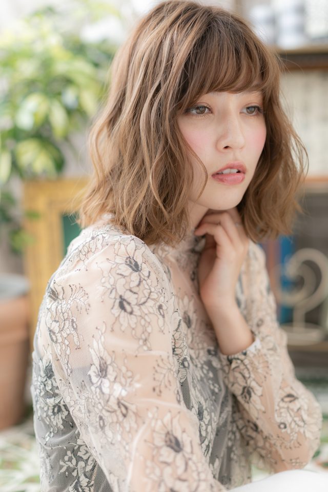 フリンジウェーブくせ毛風前下がりミディ