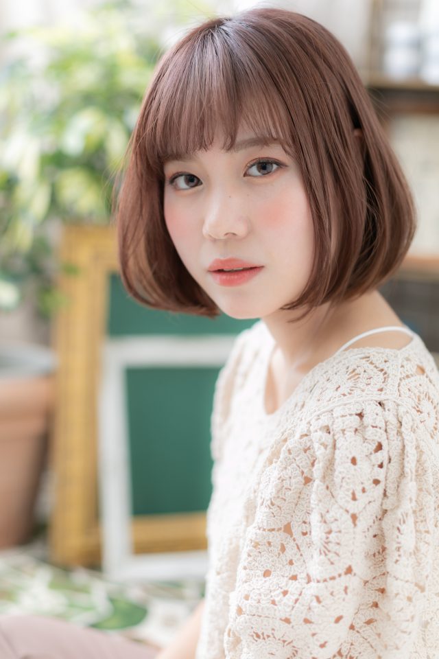 頬ラインに沿った前下がりワンカールで輪郭カバーで小顔見せを叶えるナチュラルボブのヘアスタイル。フェミニンボブや大人ボブ、エアリーボブや前下がりボブなどヘアアレンジもOK。トリートメントしたようなカラーリングもおすすめ!