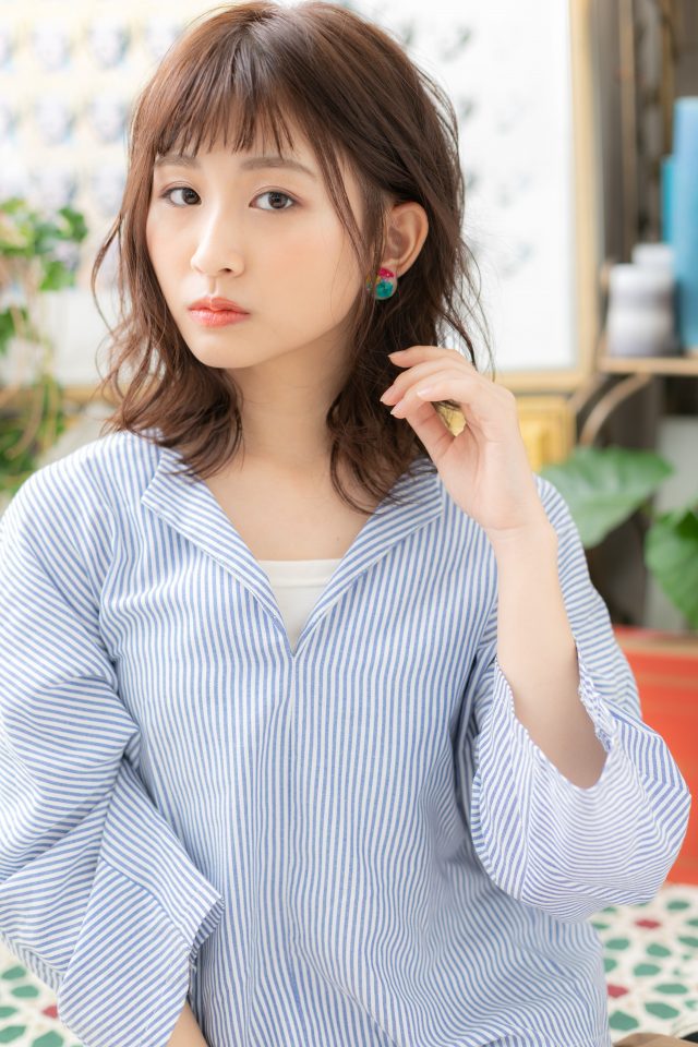 オン眉でガーリーに仕上げたゆるふわミディ。毛先パーマでエアリーに仕上げれば黒髪やローライトでも重くなりません。ミディアムヘアを際立たせるグラデーションやベージュの暗めの紙の色もおすすめ。30代にお勧めのヘアスタイルです。(メイク担当:川口店 成田)