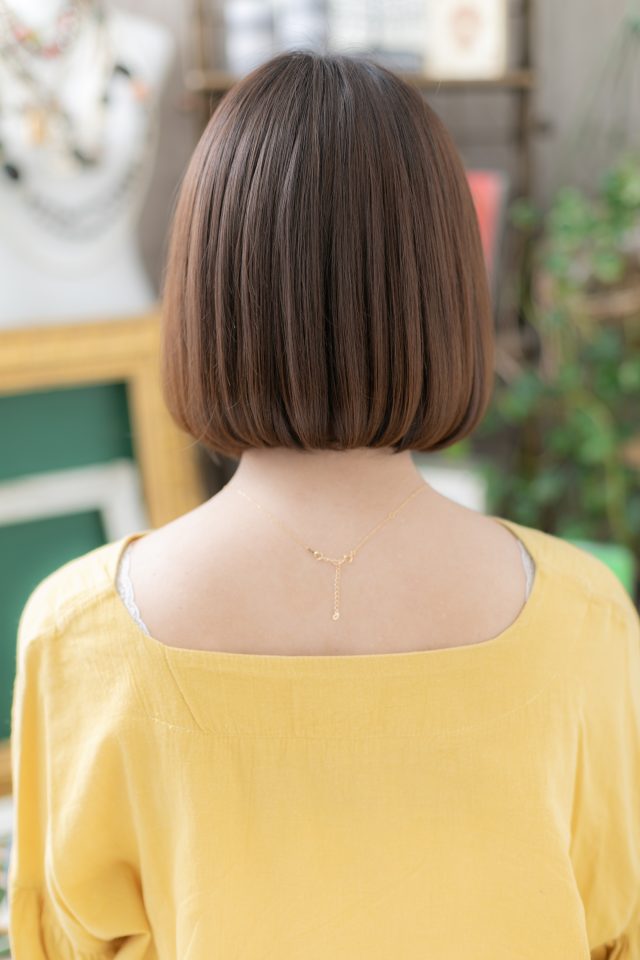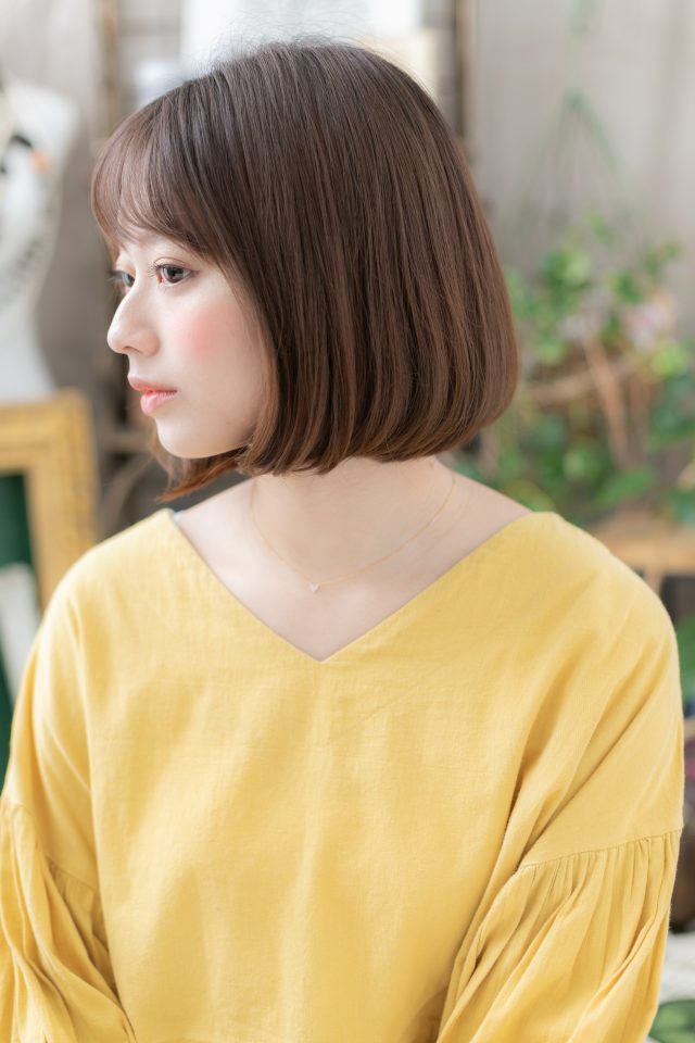 シンプルで大人かわいいナチュラルボブ。前下がりで小顔&好感度大のヘアスタイルに大人女子のコーデも完成。ミディアムヘアを際立たせるグラデーションやベージュの暗めの髪の毛もおすすめ。(メイク担当:北浦和店 棟方)