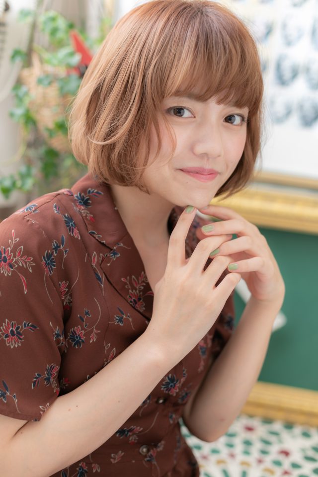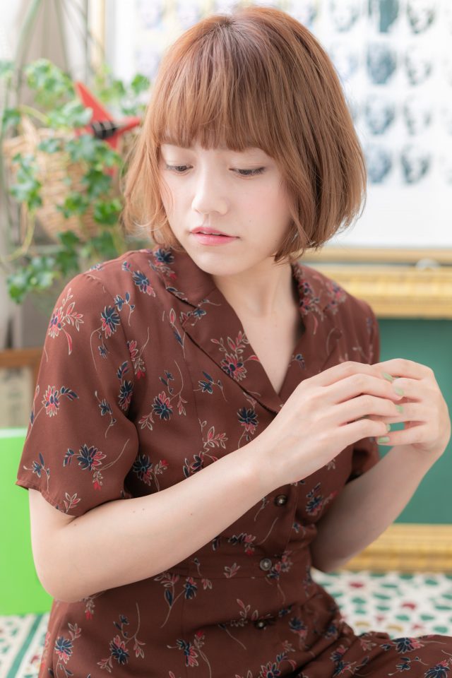 ぱっつんバングがガーリーな印象のくせ毛風ゆるふわボブのヘアスタイル。トリートメントしたようなカラーリングで髪の毛の悩みも解決。人気のカラーやベ思い通りの茶色カラーもおすすめ。