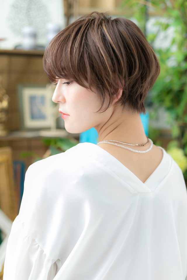 長めシースルーバングとレイヤーカットでニュアンス感ある動きを出した大人かわいいマッシュショート。トリートメントしたようなカラーリングで髪の毛の悩みも解決!30代・40代にも◎(メイク担当:北浦和店 棟方)