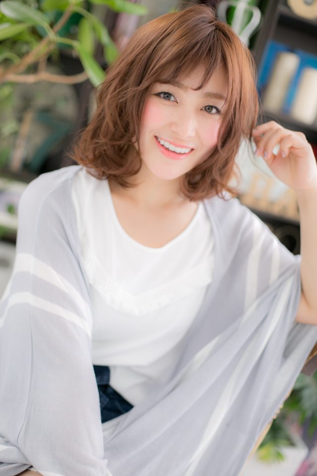 くしゅっとしたくせ毛風カールがラブなふわミディ。シースルーバングの抜け感が大人かわいい。斜めバングや厚めバングで色っぽくしたり、耳かけでフェミニンにしてもGOOD!前下がりフォルムで小顔効果も嬉しい♪
