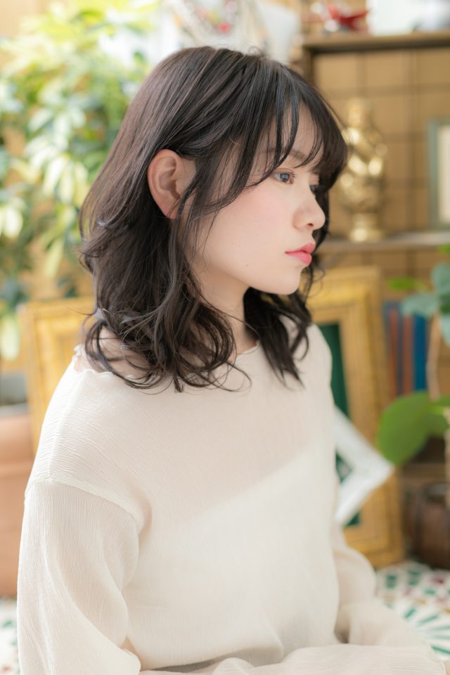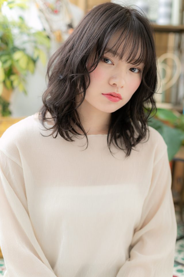 セミウェットウェーブで濡れ髪仕上げの大人かわいいくせ毛風ふわミディ。前下がりで輪郭カバーして小顔にしたり、レイヤーカットでニュアンス感ある動きを演出してもOK。斜めバングや厚めバングで目力UPしてもモテ髪型