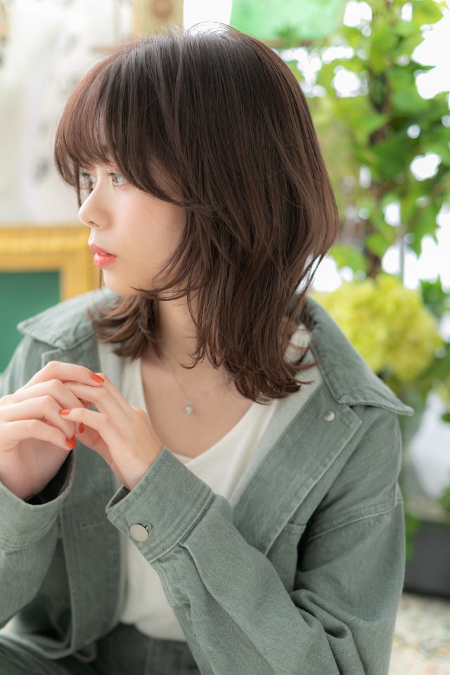 ナチュラルボブやフェミニンボブ、大人ボブや前下がりボブからの伸ばしかけにオススメのくせ毛風ふわミディ。斜めバングや厚めバング、シースルーバングで目力強調で大人女子のコーデも完成。(メイク担当:川口店 岩淵)