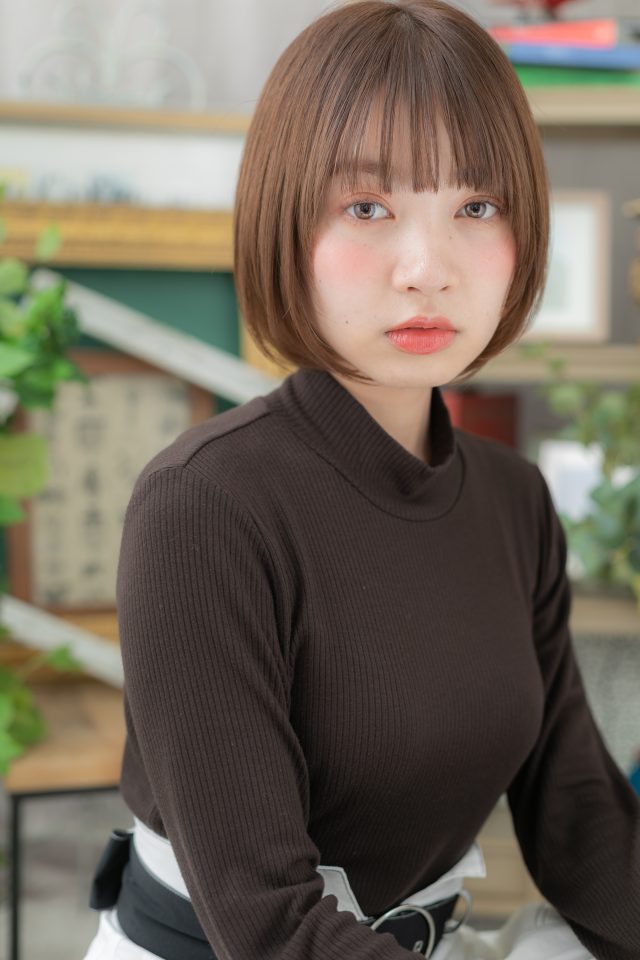 外国人風暖色系カラー小顔切りっぱなしボブ