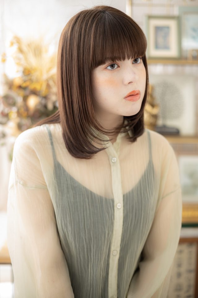 切りっぱなしボブやマッシュボブ、大人ボブ前下がりボブから伸ばしかけに。斜めバング厚めバングシースルーバングで小顔。くせ毛風ゆるふわミディや耳かけ前下がりウルフも大人かわいい。(メイク担当:川口店伊与田)