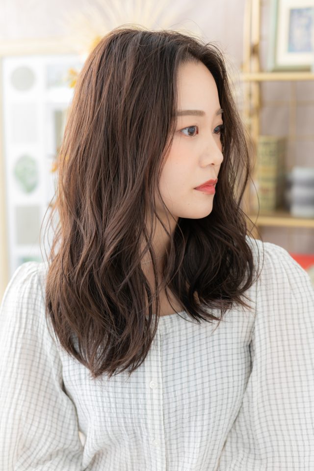 くせ毛風ゆるふわミディやエアリーミディからのイメチェンに◎耳かけアシンメトリー、前下がりや韓国風ウルフも大人かわいい。斜めバング厚めバング、シースルーバングかきあげ前髪で小顔。(メイク担当:川口店伊与田)