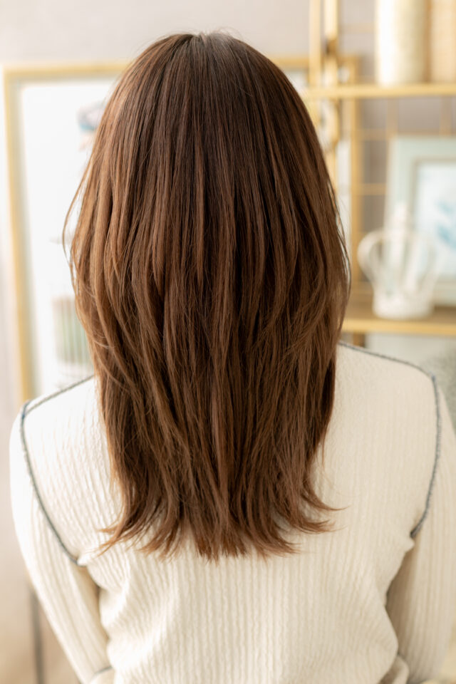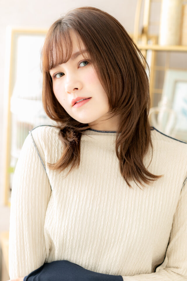 切りっぱなしボブや前下がりボブ、ナチュラルミディから伸ばしかけの方にオススメのミディアムレイヤー。ひし形シルエットで小顔に。くせ毛風ゆるふわミディや耳かけも大人かわいい。(メイク担当:COVERHAIRGROUP大西)