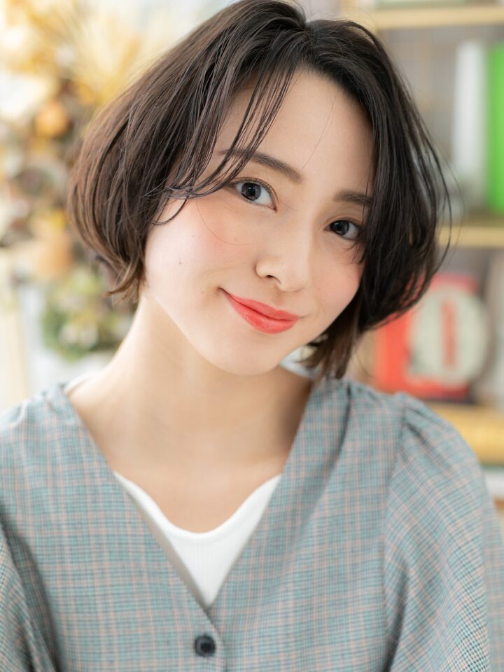 ミニボブマッシュボブ、切りっぱなしボブ丸みショートも人気。斜めバング厚めバングシースルーバングで小顔。くせ毛風ゆるふわミディや前下がり耳かけウルフも大人かわいい。(メイク担当:川口店伊与田)