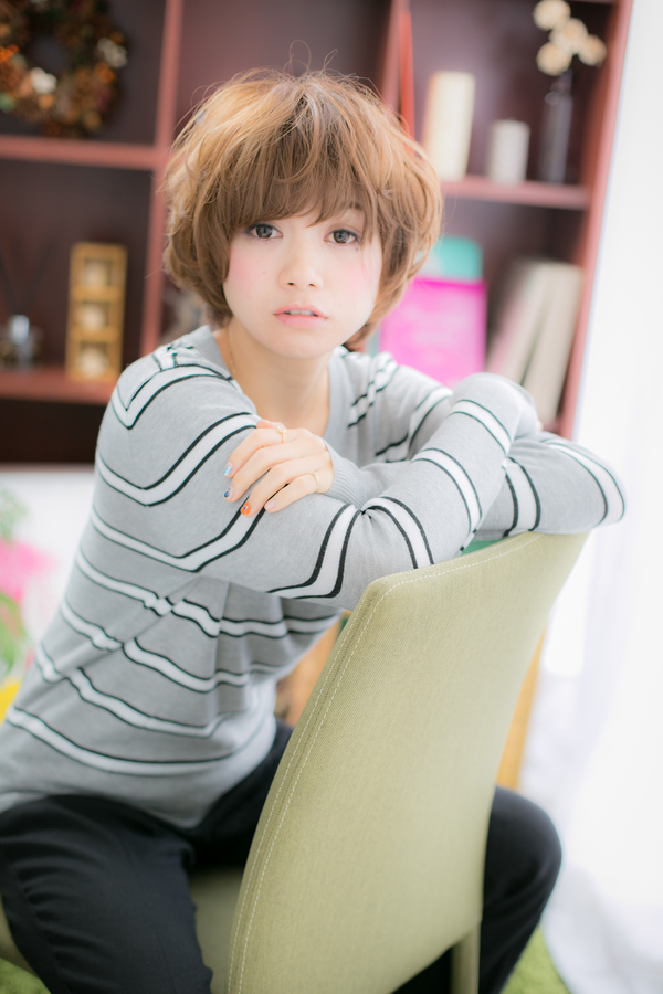 目の上ギリギリのラインのマッシュ。トップにボリュームを出しつつ、ランダムに散らして、丸いシルエットに軽さをプラス。ボーイッシュなのにガーリーな、甘辛MIXスタイルの完成!無造作なリラックスボブですが、クラシカルやモードなヘアアレンジも楽しい♪