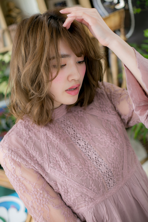風になびくようなMIXカールでふんわり仕上げたラフミディ。リラクシーな雰囲気で抜け感を出して大人っぽく。斜めバングでフェミニンにしたり、ノーバングでスマートな印象にしたり、無造作なかきあげもカッコイイ!