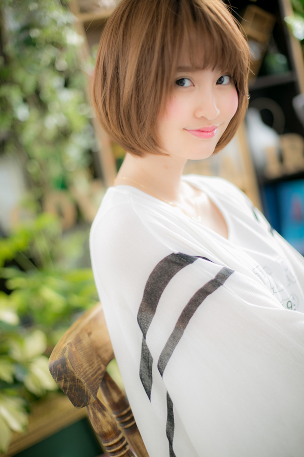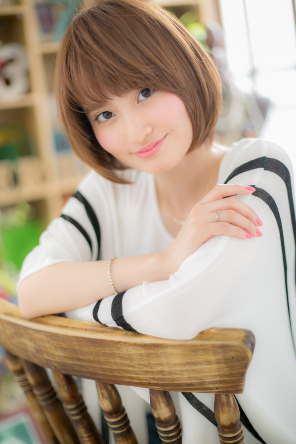 目のラインギリギリの前髪とフェイスラインを包むボブスタイルは小顔にも見えちゃうのも嬉しいポイント。肌に馴染むイエロー系の明るいカラーが優しい雰囲気も出します。