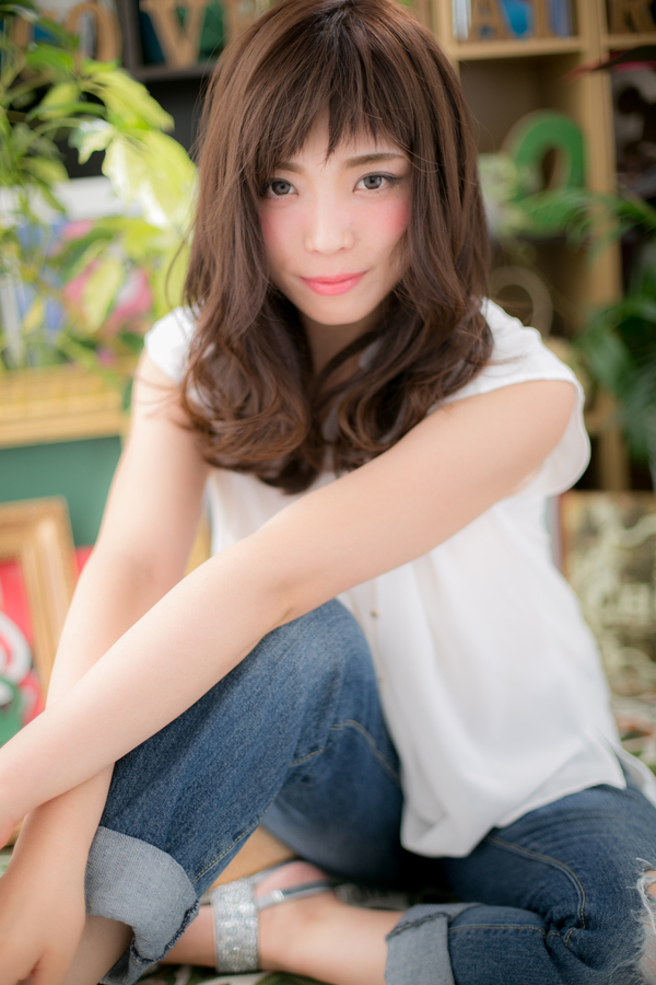 女性らしい緩やかウェーブと落ち着いたブラウンカラーが品良く見せます♪短めの前髪がポイントのアクセントになってカジュアルさもプラスに☆