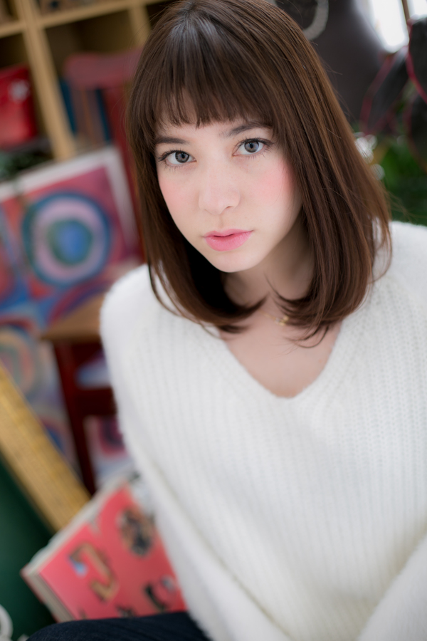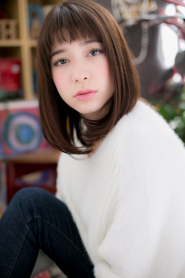 シンプルなミディアムストレートスタイルに短めのバングでアクセントを☆ダークトーンカラーが魅惑的で印象的なイメージに。