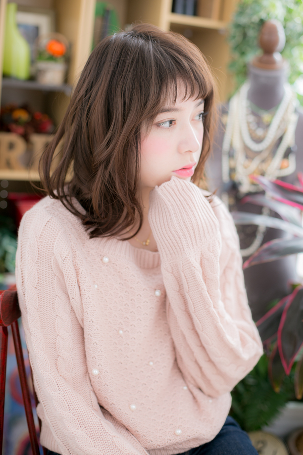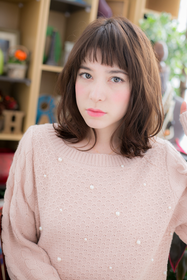 ラインの出る個性的な短めバングに重く見えない透け感が可愛い前髪と、ゆるふわウェーブがポイント☆子どもっぽくなり過ぎないよう、深みあるダークトーンで落ち着いた印象に。
