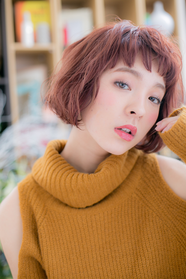 眉見せショートバングがちょっぴりレトロでオシャレなウェーブボブスタイル。周囲と差のつくレッド系カラーで個性的な仕上がりに。表情を明るくするだけでなく、美白に見せてくれますよ。