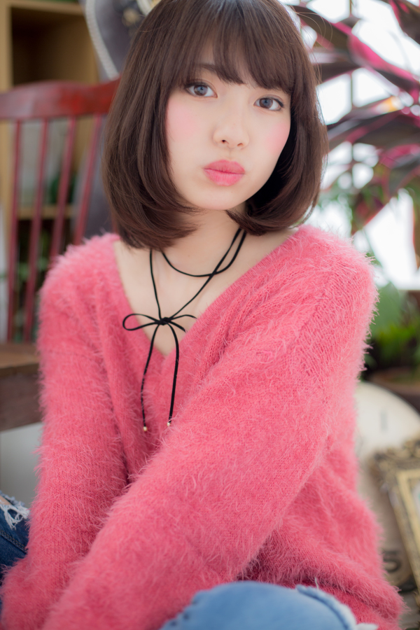 印象的なブラウン系の暗めカラーとぱっつんバングでぐんと存在感もUP!内巻きにまとまりやすくカットもされているのでハネにくくセットもしやすいです☆