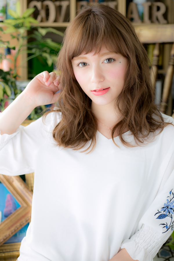 ゆる巻きカールと透け感バングで、やわらかフェミニンな印象に仕上げたエアリーセミディ。ラフな抜け感を残し、リラクシーで肩ひじ張らないエフォートレスな雰囲気に。旬顔にアップデート!