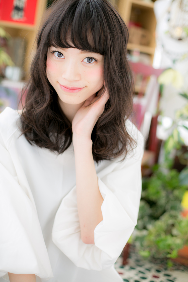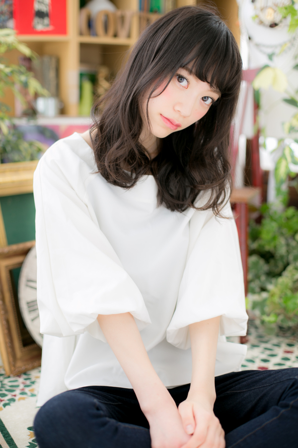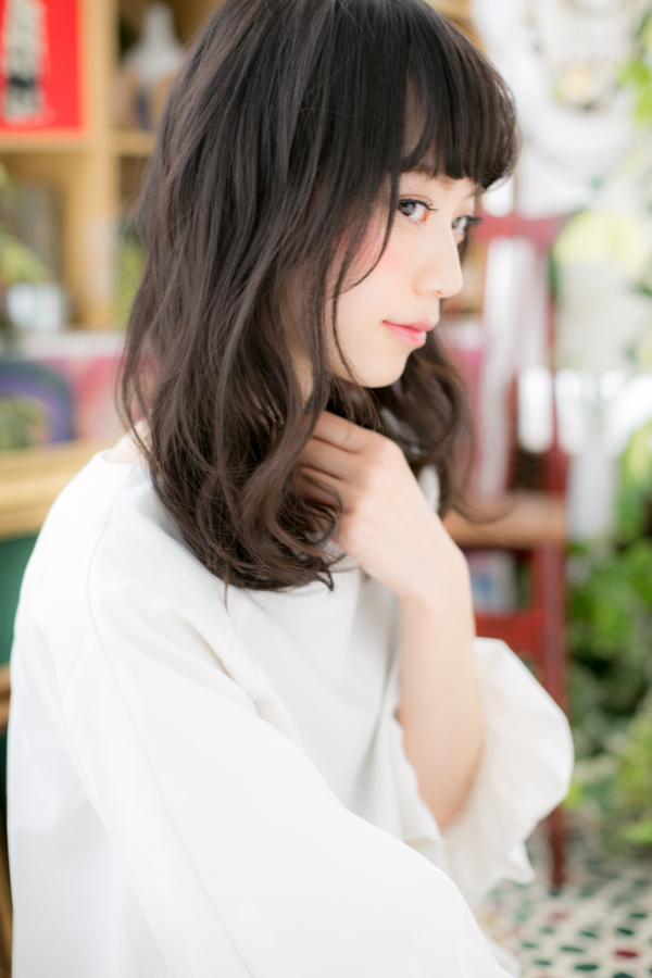 厚めバングで目元を印象付けたふわミディのヘアスタイル。落ち着いた黒髪で大人かわいい雰囲気で大人女子のファション度UP。前下がりでクールにしたり、耳かけや斜めバングでガーリーにしてヘアアレンジ。小顔効果もバッチリです。トリートメントしたようなカラーリングで髪の毛の悩みも解決!30代・40にもおすすめ!(メイク担当:川口店 成田)