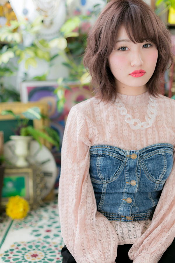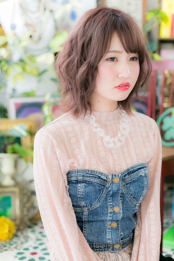 トレンドのモーブピンクで女性らしさをプラス。ひし形シルエットのヘアスタイルにメリハリを。前下がりで小顔に見せれば小顔効果も◎斜めバングや厚めバングで目力UP!オン眉も個性的で大人女子のファション度UP☆ミディアムヘアを際立たせるグラデーションやトリートメントしたようなカラーリングで髪の毛の悩みも解決!30代・40代にも◎(メイク担当:北浦和店 棟方)