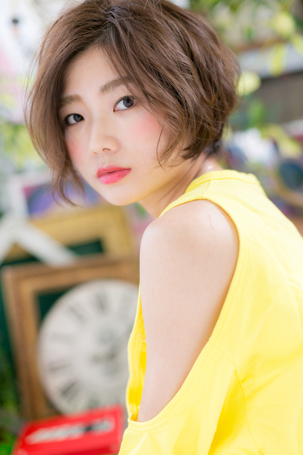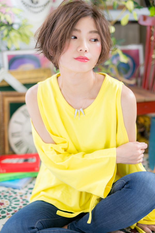動きのあるショートでピュアで元気なヘアスタイル。長めバングで大人っぽく雰囲気で大人女子のコーデを完成。前下がりで小顔対策も◎ハネ感も生かしつつワックスを手にもみこみ、根元からつけるだけの簡単スタイリング。トリートメントしたようなカラーリングで髪の毛の悩みも解決!人気のカラーやアッシュグレー、ブリーチなしもおすすめ!30代・40代にも◎(メイク担当:川口店 成田)