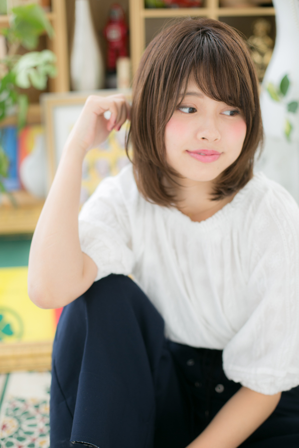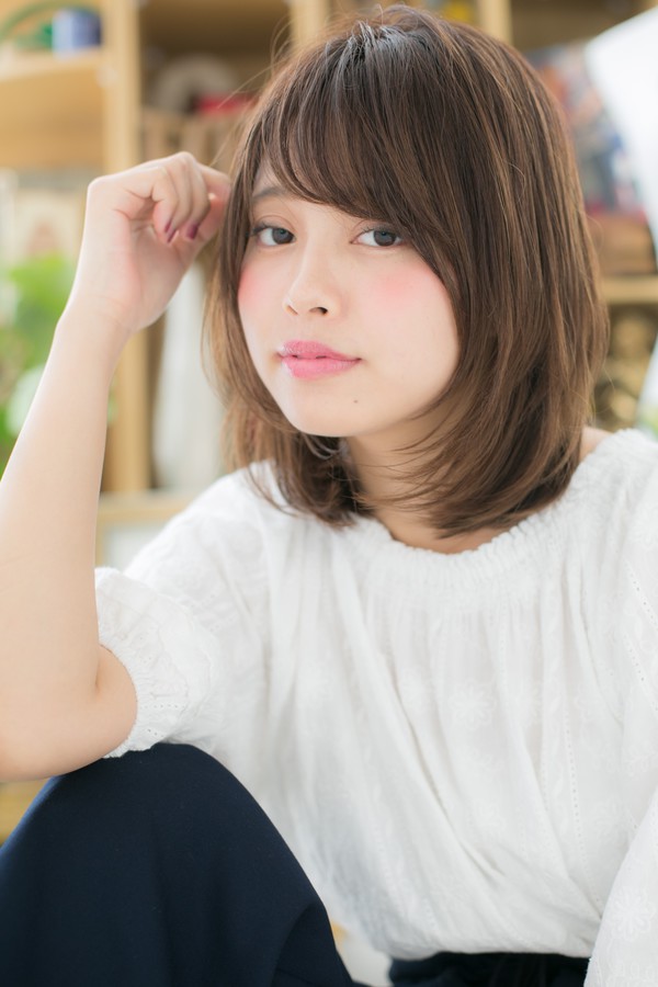 斜めバングがポイント☆ナチュラルミディを目力UPのガーリーセミディに格上げします。厚めバングやオン眉も個性的でラブガーリーで大人女子のファション度UP。くせ毛風パーマのふわミディや耳かけも◎ミディアムヘアを際立たせるグラデーションやベージュで暗めの髪の色で髪の毛の悩みも解決!40代のエラ張り対策にもおすすめ!(メイク担当:川口店 成田)