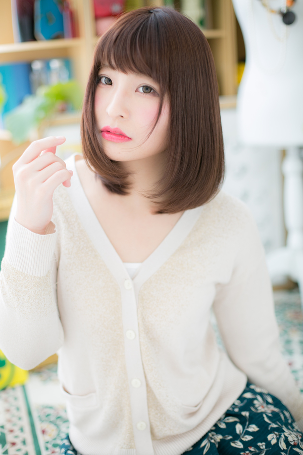 厚めバングで目元を印象つけたワンカールのヘアスタイル。くせ毛風ふわミディや耳かけで大人女子のファッション度UP。ミディアムヘアを際立たせるグラデーションやベージュで髪の毛の悩みも解決!40代のエラ張り対策にもおすすめ!(メイク担当:川口店 成田)