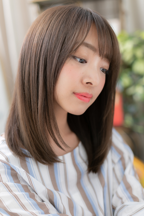 シンプルなナチュラルミディはツヤと透明感がポイントで大人女子のファッション度UP.ミディアムヘアを際立たせるグラデーションやベージュの暗めの髪の色もおすすめ!40代のエラ張り対策◎(メイク担当:北浦和店 棟方)