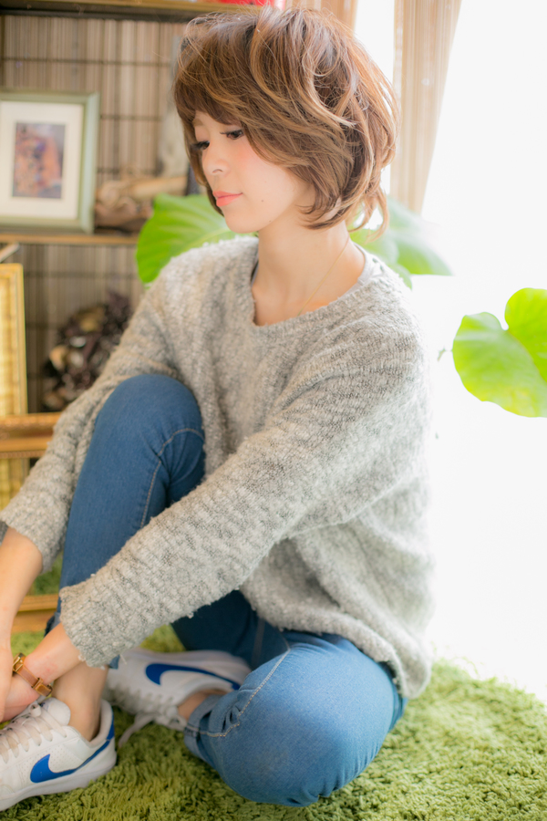 前髪から顔周りにかけて、ラウンドにつながるようにカット。ランダムなミックスカールで無造作なクセ毛風に。外国の少女のような、フェアリーでリラクシーな雰囲気に仕上がります♪短めバングでキュートな抜け感を。斜めバングや厚めバングにしてもカワイイ☆