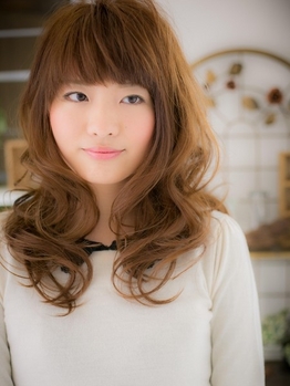 大人可愛いふんわりカールは、デジタルパーマで作るのがオススメ!イエロー系のカラーで旬なイメージに!片側を耳かけにするとラブリー感がプラスされます!