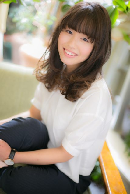 斜めバング&厚めバングで目力強調!大人女子力UPのふわミディはくせ毛風パーマでふんわりやわらかに仕上げでコーデを完成!耳かけや小顔に見せる前下がりもOK。上目遣いが似合います♪トリートメントしたようなカラーリングで髪の毛の悩みも解決!30代・40にもおすすす☆(メイク担当:北浦和店 近藤)