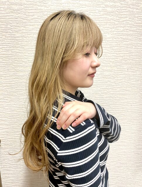 柔らかな色味のハイトーンと、柔らかなカールのサイドバングで、よりエアリーな優しい雰囲気に♪