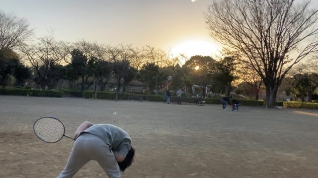 (お休み中はバドミントン対決!全集中の決めポーズ♪)