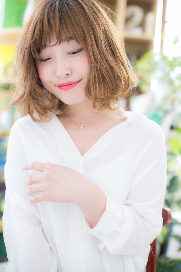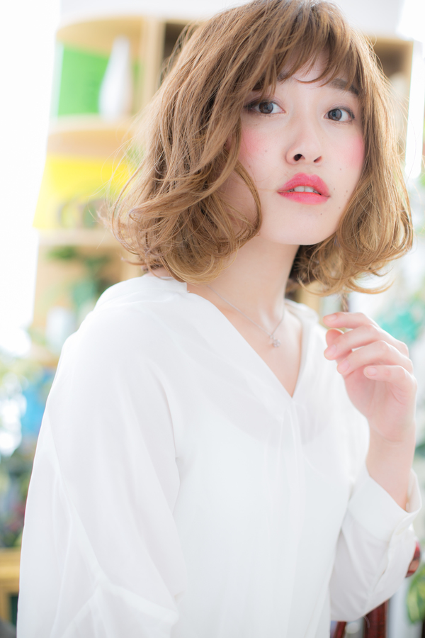 耳横でふわっと広がるAラインシルエットで小顔に仕上げたふわミディのヘアスタイル。くせ毛風カールと斜めバングが大人かわいい。ベージュカラーやミディアムヘアを際立たせるグラデーションカラーで顔周りをグラマラスに。トリートメントしたようなカラーリングで髪の毛の悩みも解決!人気のカラーやアッシュグレー、ブリーチなしもおすすめ☆オン眉や切りっぱなしボブも個性的で大人女子のファション度UP◎30代・40代にも◎