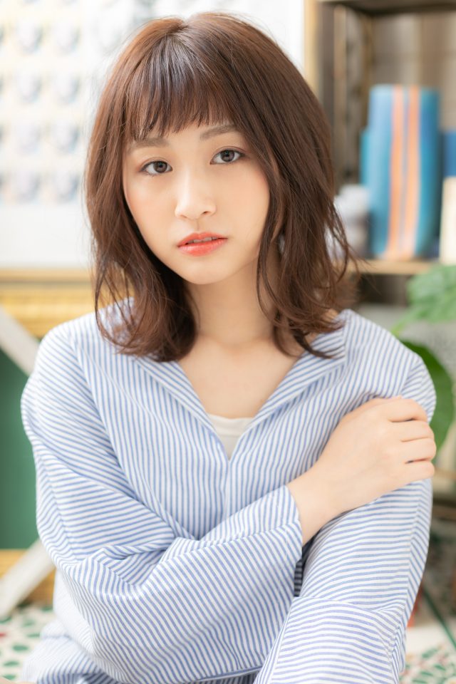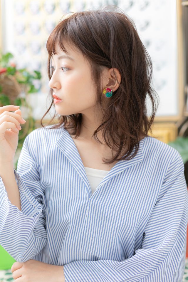 オン眉でガーリーに仕上げたゆるふわミディ。毛先パーマでエアリーに仕上げれば黒髪やローライトでも重くなりません。ミディアムヘアを際立たせるグラデーションやベージュの暗めの紙の色もおすすめ。30代にお勧めのヘアスタイルです。(メイク担当:川口店 成田)