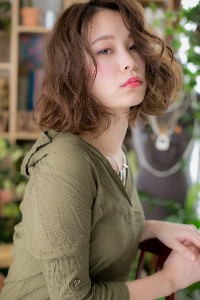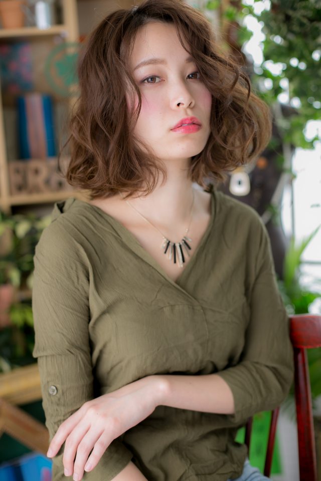 高めの位置からのランダムカールでボリューミーなAラインシルエットに。小顔対策もバッチリです。グラマラスな雰囲気で女度UP!表情をチラ見せしてアンニュイな印象にしたり、濡れ感あるセミウェットな質感も色っぽい。