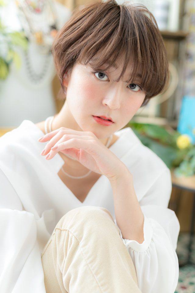 長めシースルーバングとレイヤーカットでニュアンス感ある動きを出した大人かわいいマッシュショート。トリートメントしたようなカラーリングで髪の毛の悩みも解決!30代・40代にも◎(メイク担当:北浦和店 棟方)