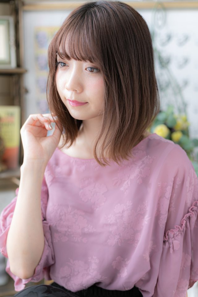 斜めバングや厚めバングで目力UP。ミディアムヘアを際立たせるグラデーションでヘアスタイル。くせ毛風ゆるふわミディや耳かけ韓国風で大人女子のファッションUP。(メイク担当:川口店 成田)