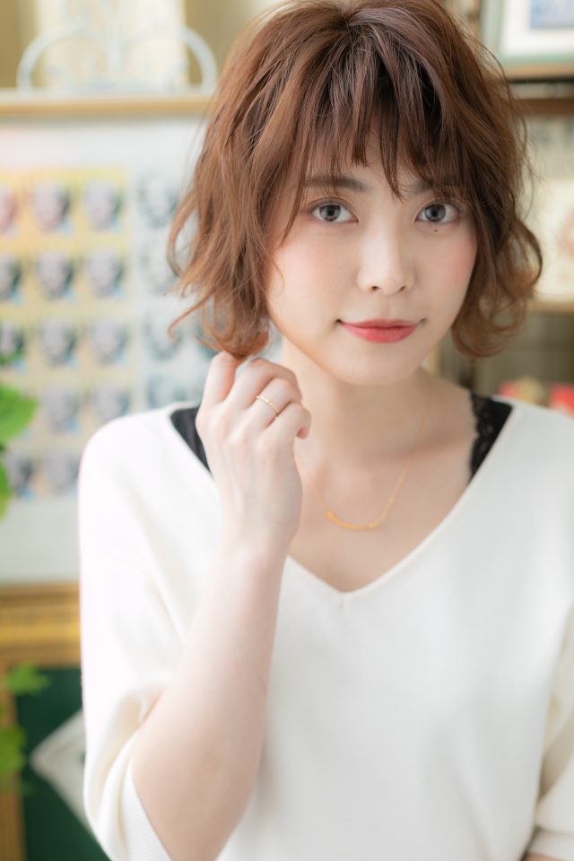 くせ毛風ゆるふわミディや耳かけが大人かわいい。前下がりで小顔。斜めバングや厚めバング、かきあげ前髪で目力UP。ナチュラルボブやフェミニンボブ、大人ボブや前下がりボブの伸ばしかけに◎(メイク担当:川口店 岩淵)