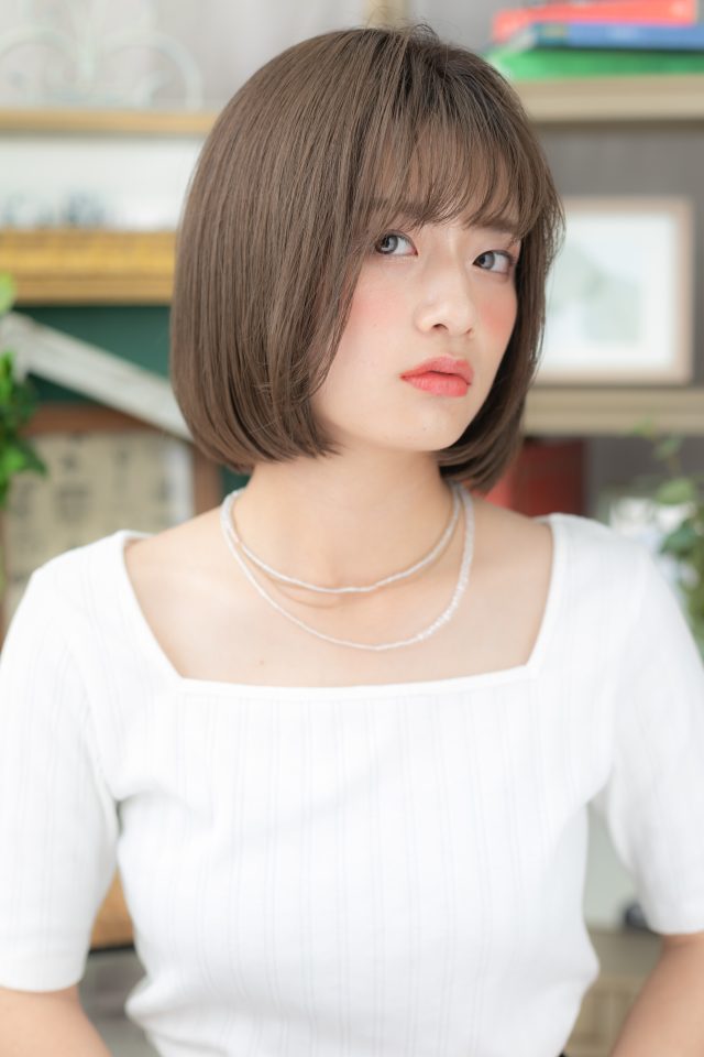 斜めバング厚めバング、かきあげ前髪も大人かわいい。くせ毛風ゆるふわミディや耳かけ前下がりウルフで小顔に。ナチュラルボブやフェミニンボブ、大人ボブや前下がりボブ、ミニボブも人気。(メイク担当:川口店 岩淵)