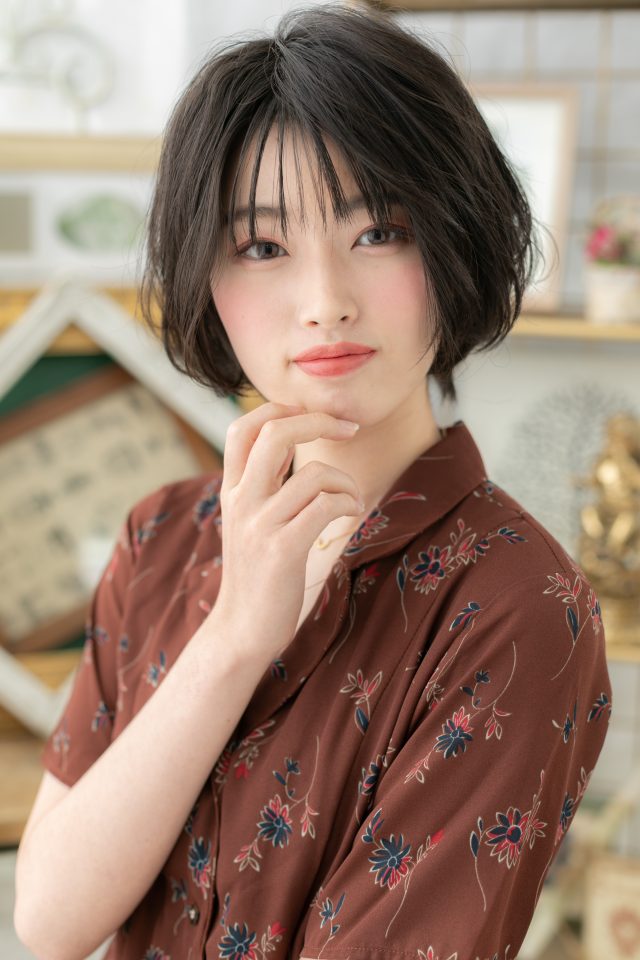 斜めバング厚めバングシースルーバングで小顔。くせ毛風ゆるふわミディや耳かけ前下がりウルフも大人かわいい。ナチュラルボブフェミニンボブ、大人ボブ前下がりボブミニボブもOK。(メイク担当:COVERHAIRGROUP大西)
