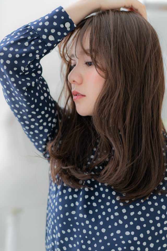 斜めバング厚めバングシースルーバングで小顔。くせ毛風ゆるふわミディや耳かけ前下がりウルフが大人かわいい。ナチュラルボブフェミニンボブ,大人ボブ前下がりボブ,切りっぱなしボブも◎(メイク担当COVERHAIRGROUP成田)